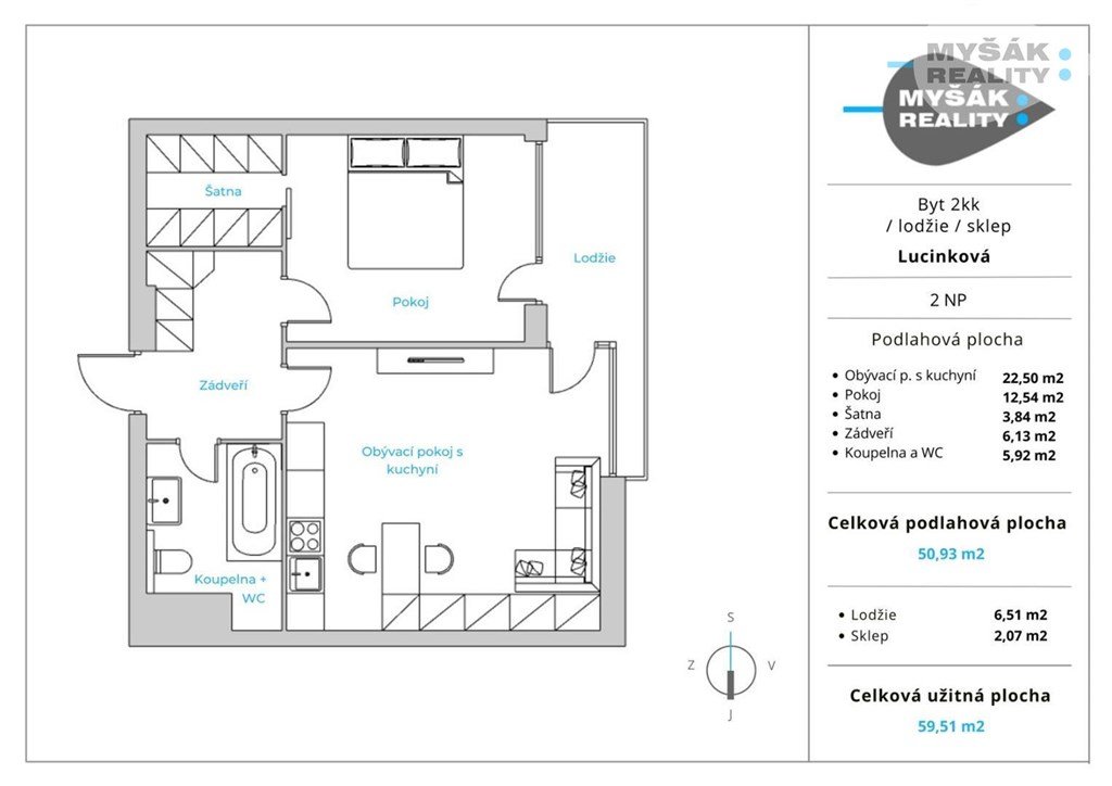 Nízkonákladový byt v prvním patře novostavby z roku 2005, v Hostavicích, je koncipovaný jako 2+kk, s celkovou užitnou plochou 59,51m2 (byt 50,93m2 + lodžie 6,51m2+ sklep 2,07m2).