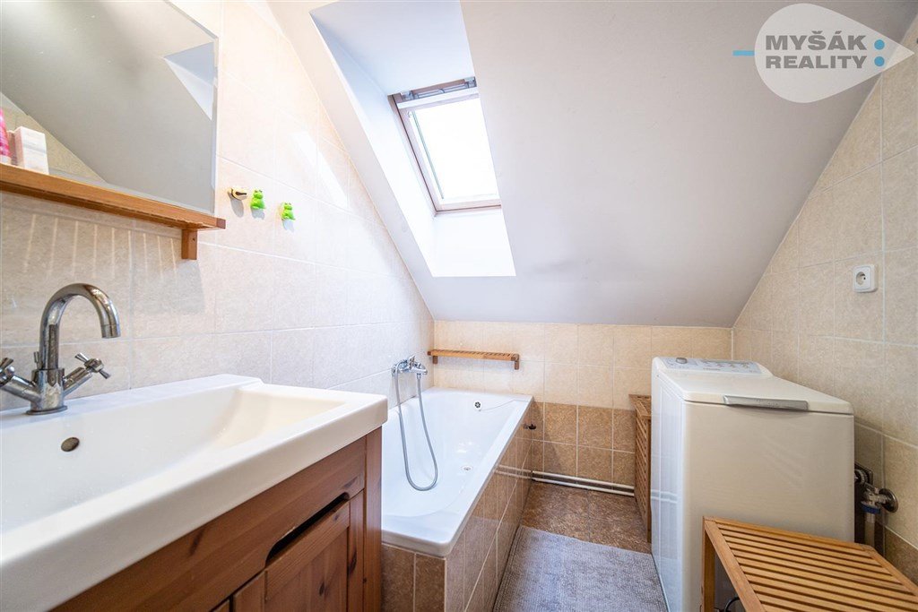 Vše ve vyšším standardu – odolné dřevěné podlahy, kvalitní interiérové dveře, bezpečné a prakticky vyřešené schody, velká střešní okna, kuchyňská linka na míru a zachování původních půdních trámů, dodává skvělou atmosféru.