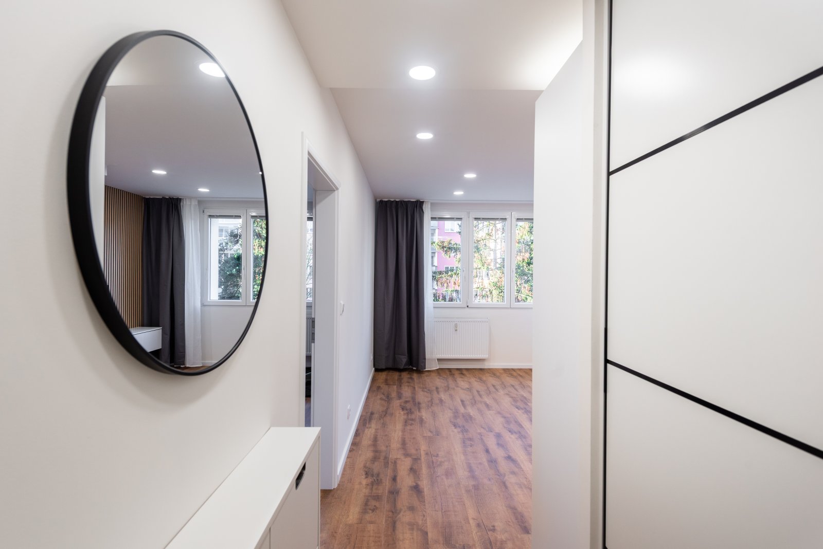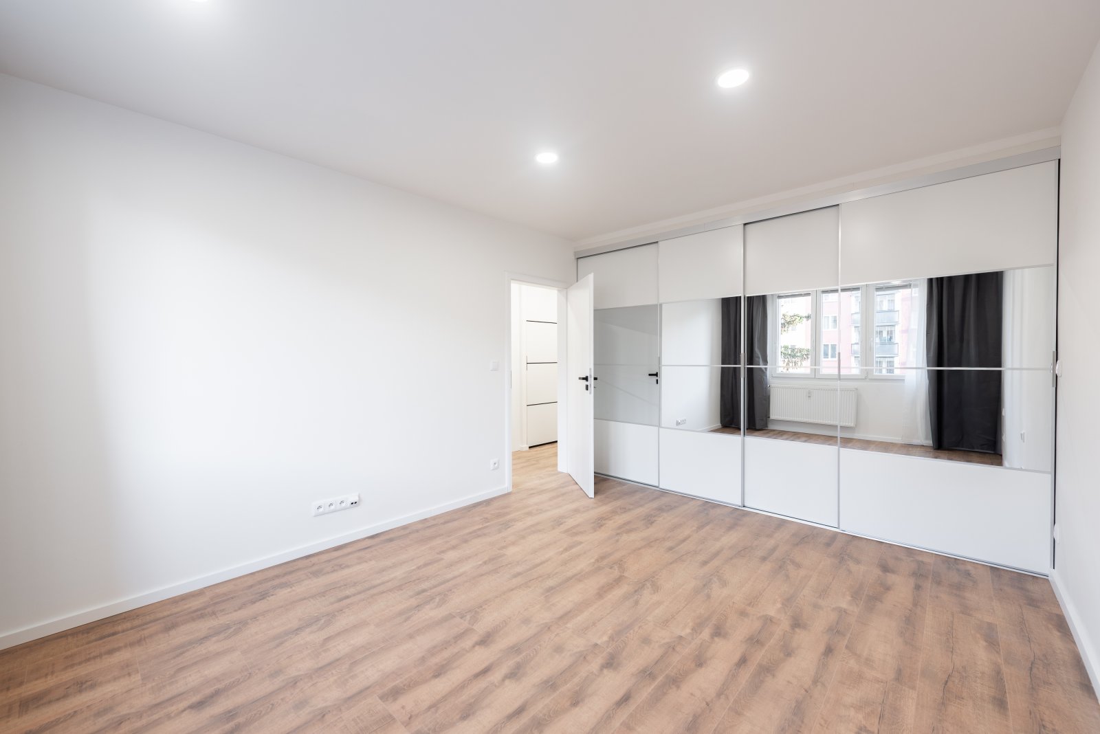 V ložnici se nachází prostorná vestavná šatní skříň, která vyplňuje celý prostor u zdi do výšky i šířky. Skříň je zrcadlová, prostor tak opticky zvětšuje a prosvětluje a je vybavená také osvětlením. Bylo pamatováno i na část skříně, kam se vejde žehlící prkno, vysavač či sušák na prádlo.