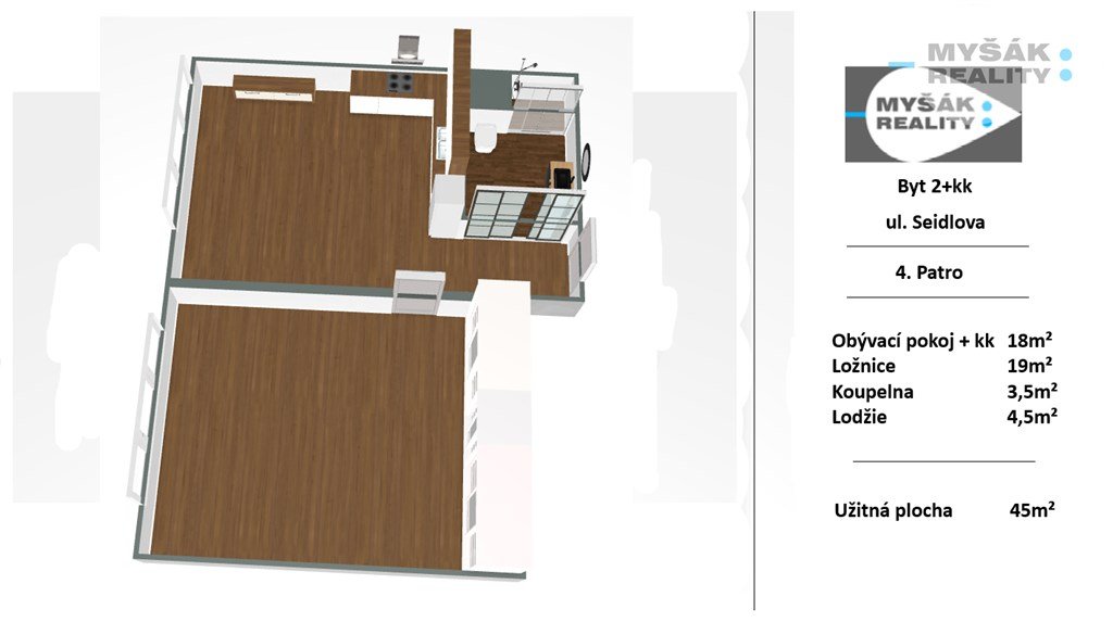 Byt je po kompletní, velmi nadstandardní, rekonstrukci, dotažené do detailu a nebyl po zmíněné rekonstrukci doposavad bydlen. Byt tvoří dvě prostorné místnosti - obývací pokoj s kuchyňským koutem (18m2) a ložnice (19m2).