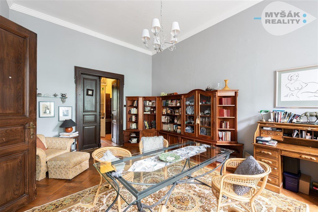 V bytě jsou zachovány původní prvky jako dřevěné obložení dvojitých oken, funkční krb a kachlová kamna. Stejně tak dřevěné dvoukřídlé dveře s ozdobnými zárubněmi, parkety a 3,8 metru vysoké stropy.