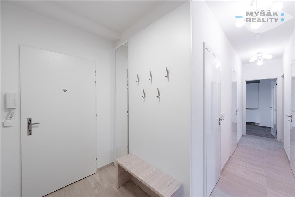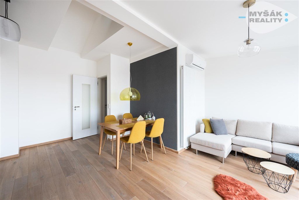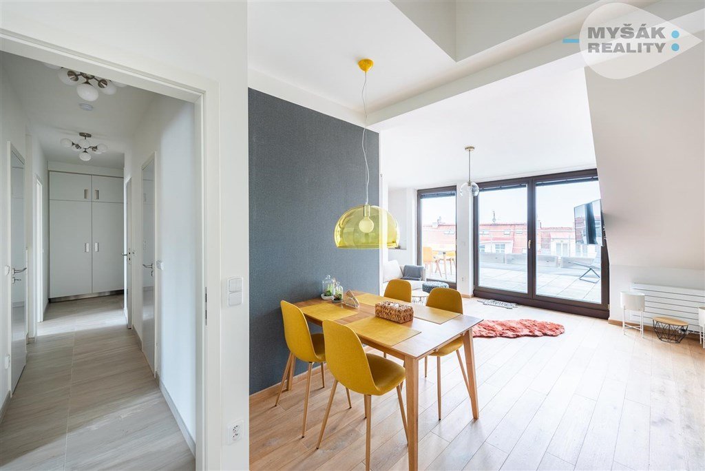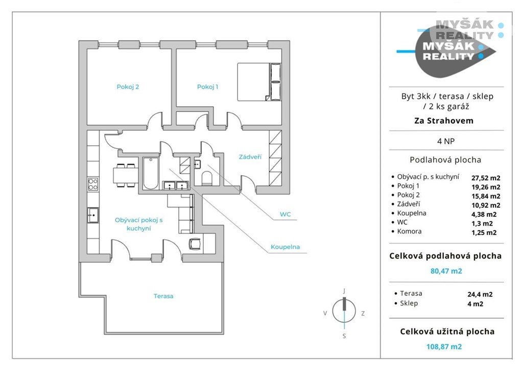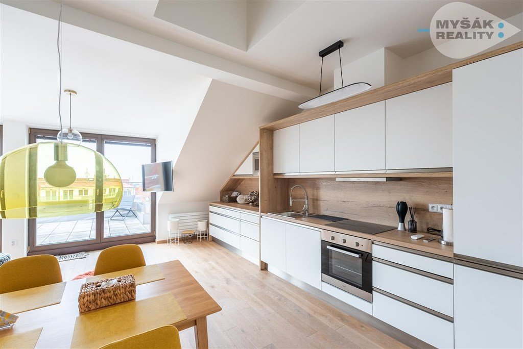 Byt je koncipován jako 3+KK (80,47 m2) s velkou terasou (24,4 m2) a nikde se na něm nešetřilo. V chodbě a celém bytě jsou kvalitní vestavěné skříně, dřevěné podlahy, designová světla a klimatizace.