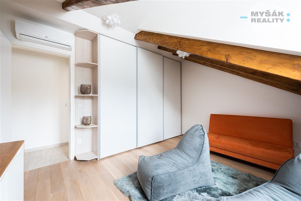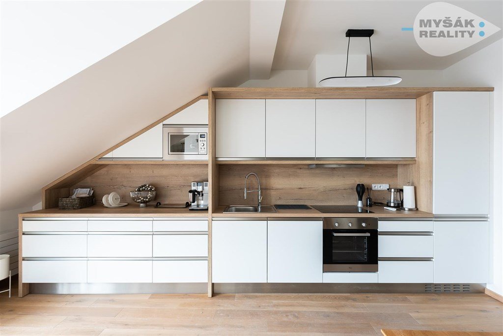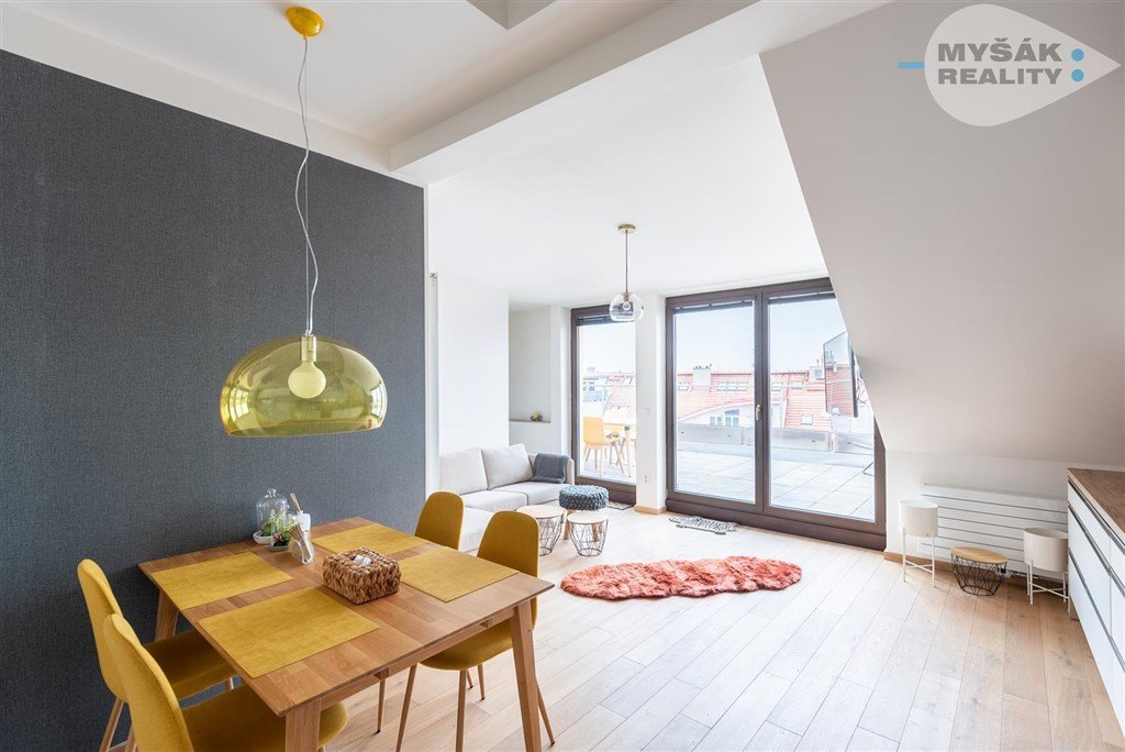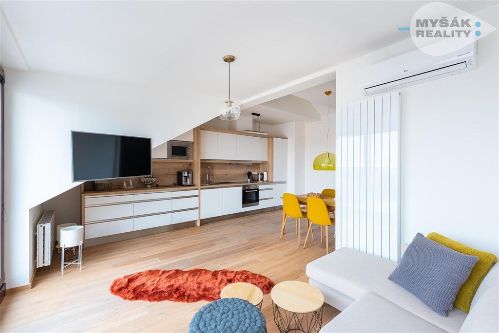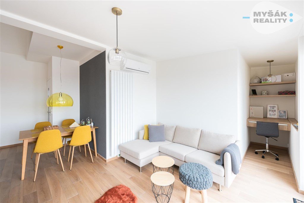 Srdcem bytu je obývací pokoj s kuchyňským koutem s rozlohou 28m2. Prostor je plný přirozeného světla a když slunce zapadne, atmosféru budou místnosti dodávat designová světla z Itálie. Kuchyň je na míru a díky tomu využitá do posledního centimetru. I zde je na prvním místě kvalita a celkové vyznění. V obývacím pokoji je i jeden malý koutek, který může sloužit jako pracovna.