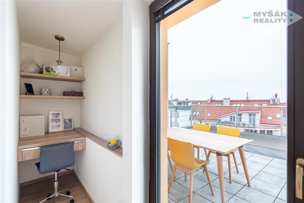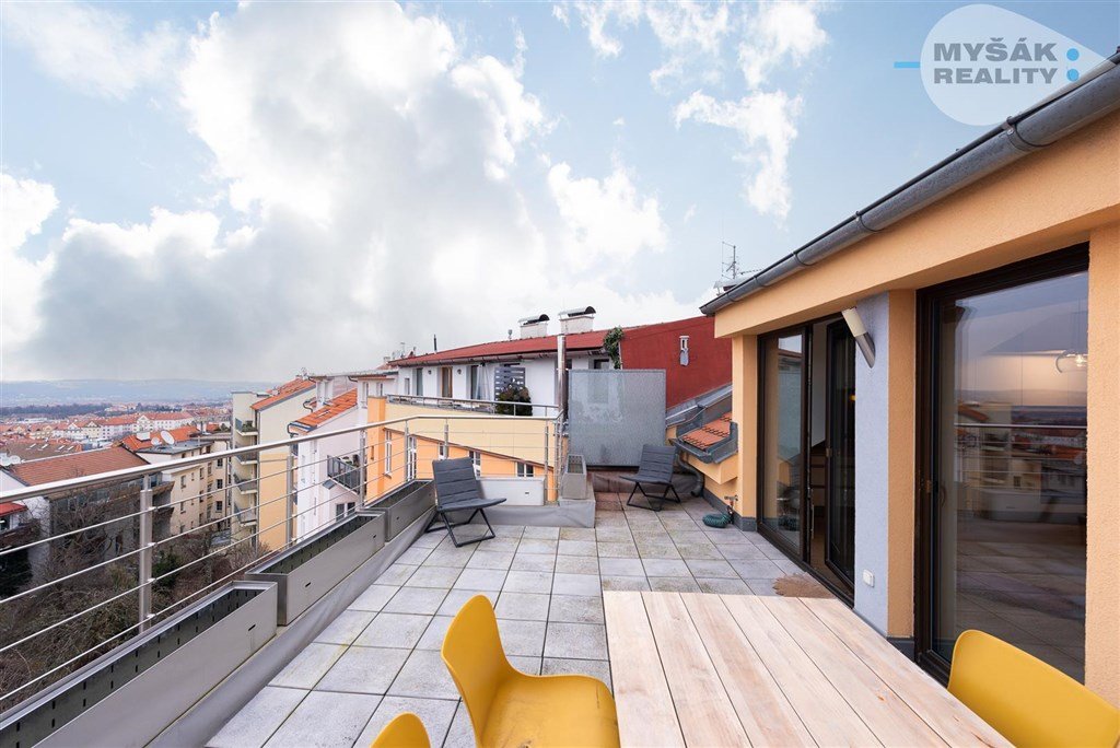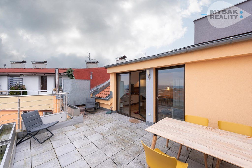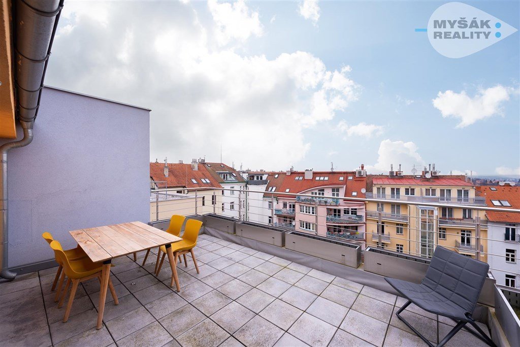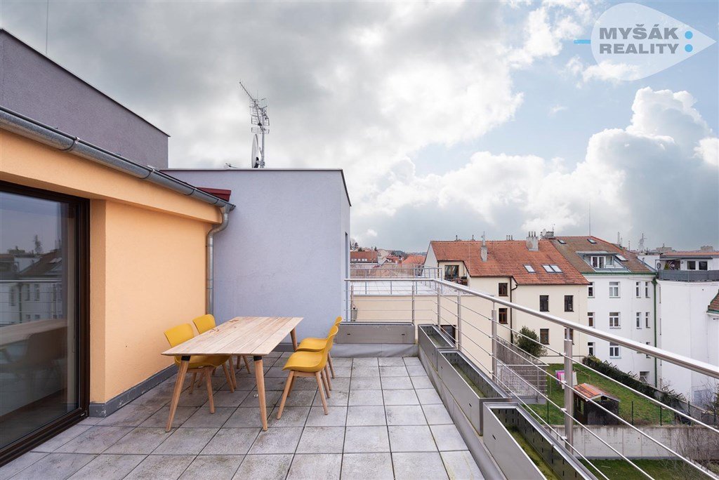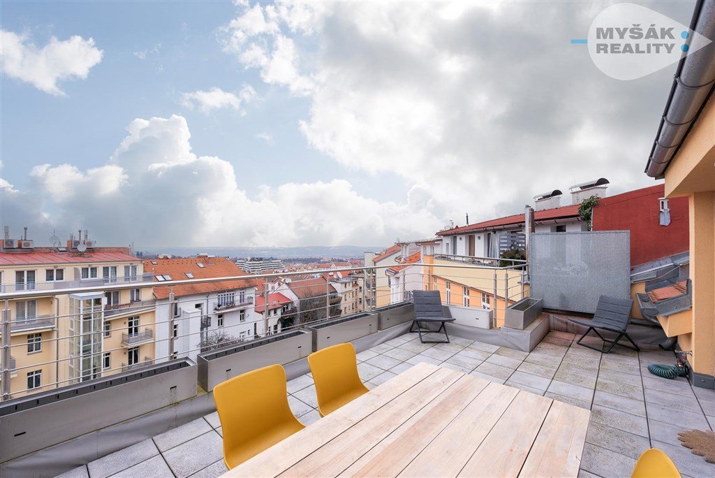 Velkolepým finále celého bytu jsou poslední dveře, ty vedou na terasu s posezením. Terasa s velkorysou plochou 24m2 směřuje do vnitrobloku a je z ní výhled na starý Břevnov, Dlabačov, Bohnice, Troju a trojský zámek. Bude skvělým místem pro soukromá setkání s přáteli, ranní jógu, večerní skleničku a víkendové dlouhé obědy s blízkými.