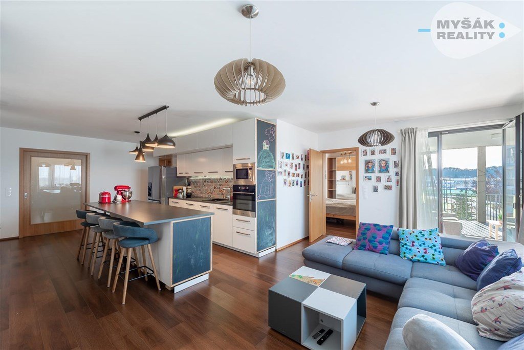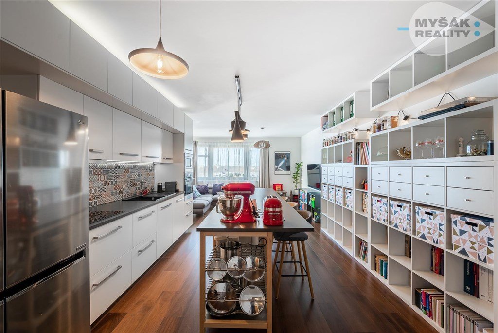 Vnitřní členění bytu je přesně jak má být, chytře řešené, účelné i reprezentativní, dotažené do detailu. Srdcem bytu je 42 m2 velký obývací pokoj, s plně vybavenou kuchyňskou linkou, do níž jsou zabudovány všechny spotřebiče (indukční varná deska, myčka, trouba, mikrovlnná trouba, velkou výhodou je i drtič odpadků) a prostor zůstal i na velkou lednici amerického typu. Kuchyň má rozšířenou pracovní plochu o ostrůvek . Obytné části pokoje dodávají dostatek vzdušnosti a světla velká okna západním směrem a vstup na terasu.