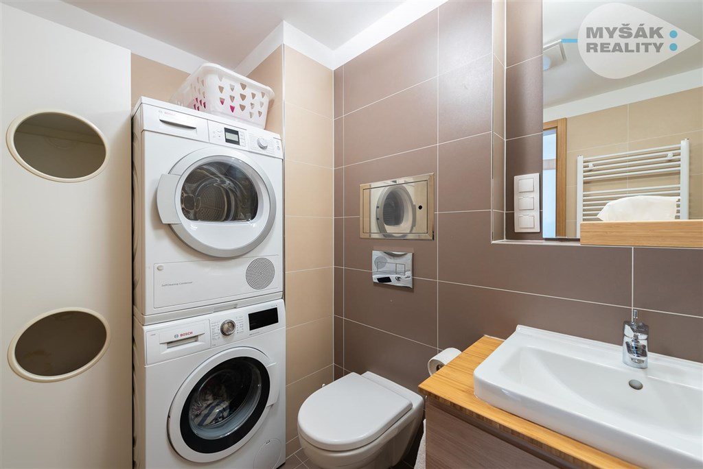 Všechny tři ložnice jsou neprůchozí a mají pěknou výměru (12, 11 a 13 m2). Díky velkým oknům s jižní a západní orientací jsou plné světla a slunce, před kterým se můžete případně chránit žaluziemi. Největší z nich (ložnice rodičů), má vstup do vlastní koupelny se sprchovým koutem a toaletou. Druhá koupelna je samozřejmě vybavena vanou a rovněž i toaletu. Zde je také prostor pro pračku i sušičku. Obě koupelny jsou také vybaveny tepelným žebříkem a obloženy velkoformátovými dlaždicemi s tmavším nadčasovým designem.