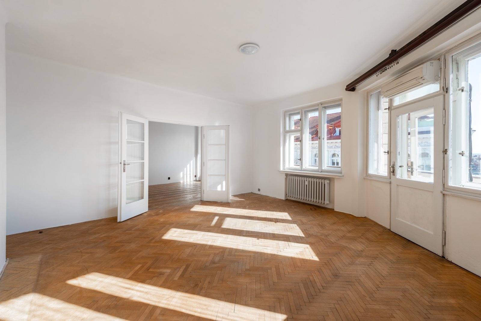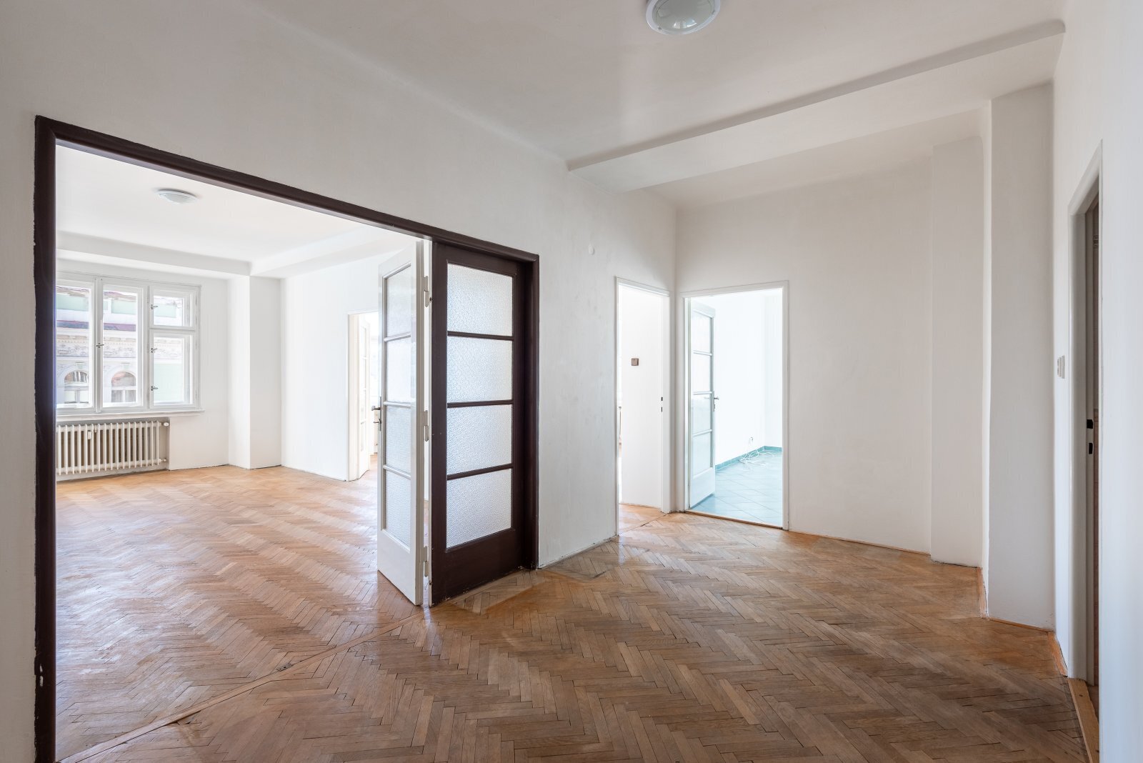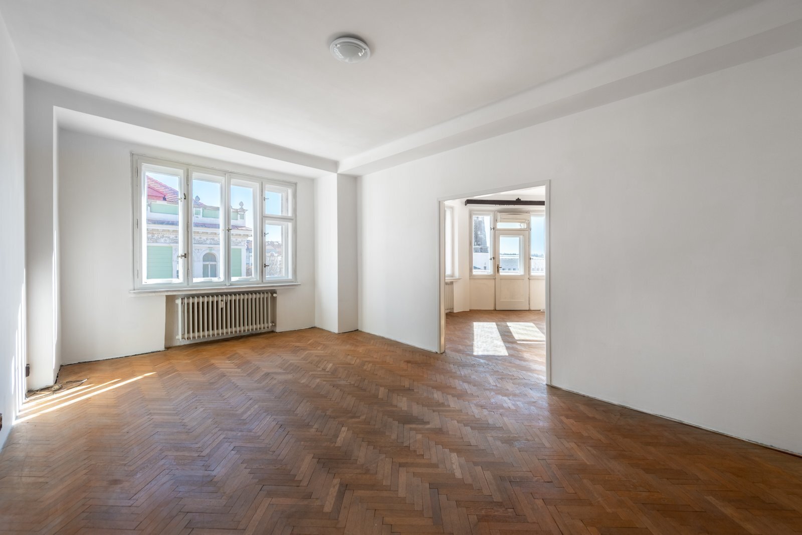Dva nádherné prostorné pokoje (26 a 25 m²) s vysokými stropy, dubovými parketami a špaletovými okny dýchají noblesou starých časů.