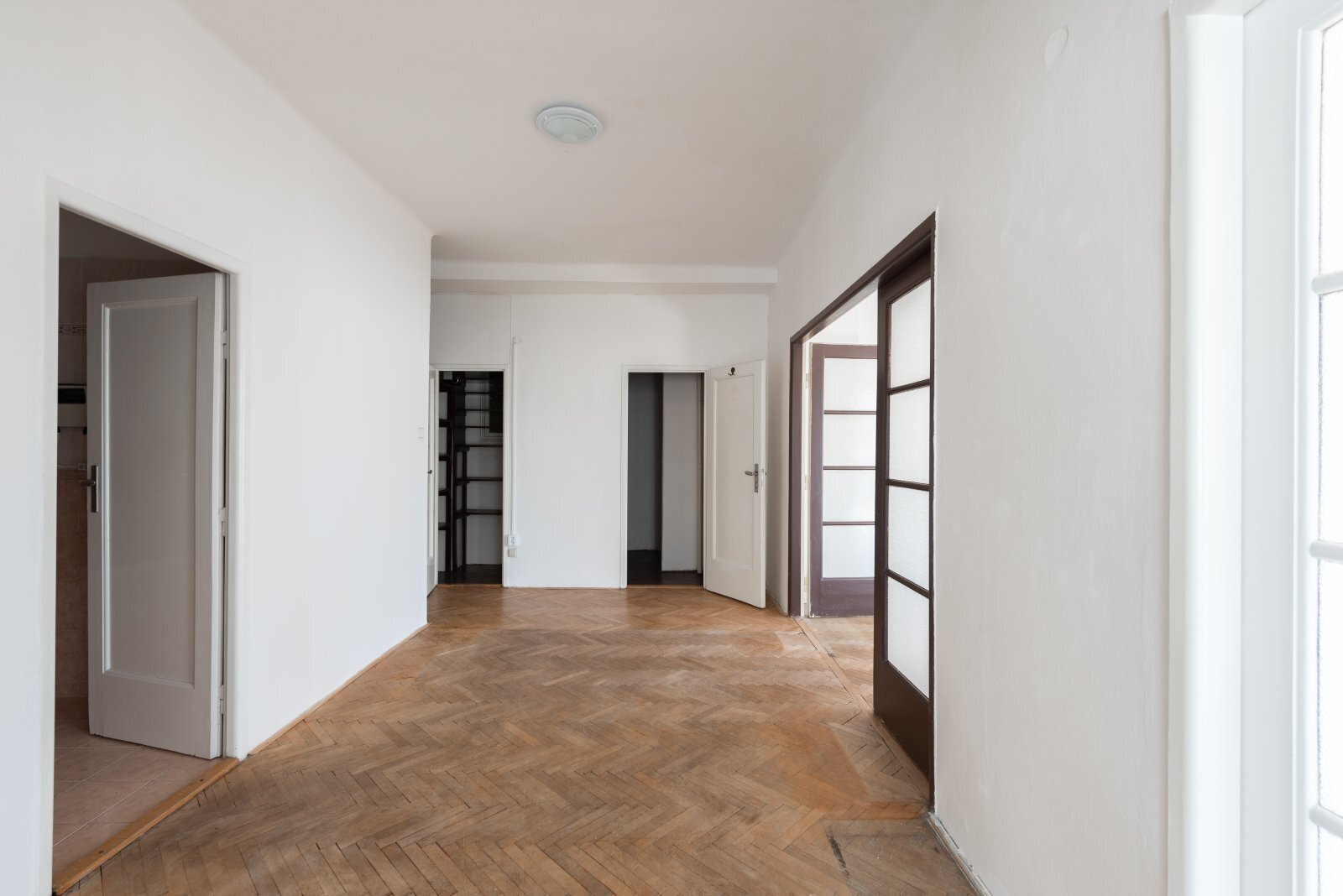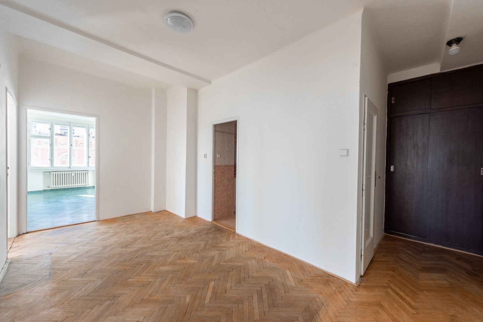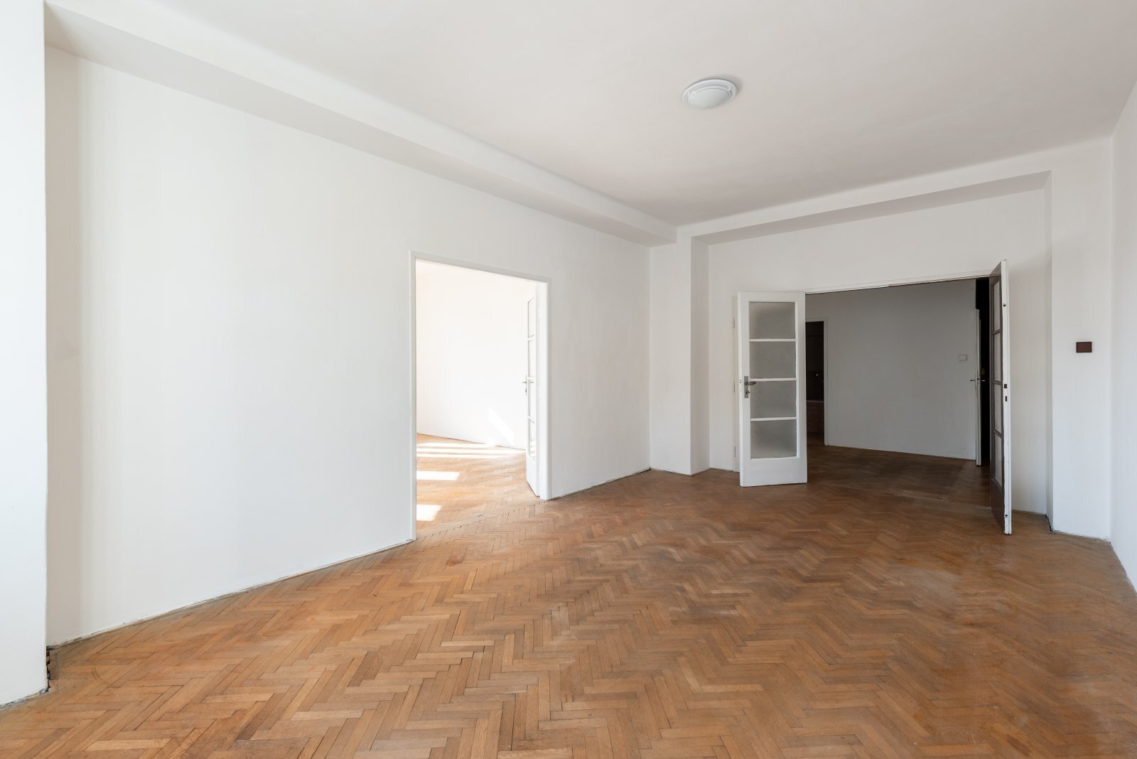 Dva nádherné prostorné pokoje (26 a 25 m²) s vysokými stropy, dubovými parketami a špaletovými okny dýchají noblesou starých časů.