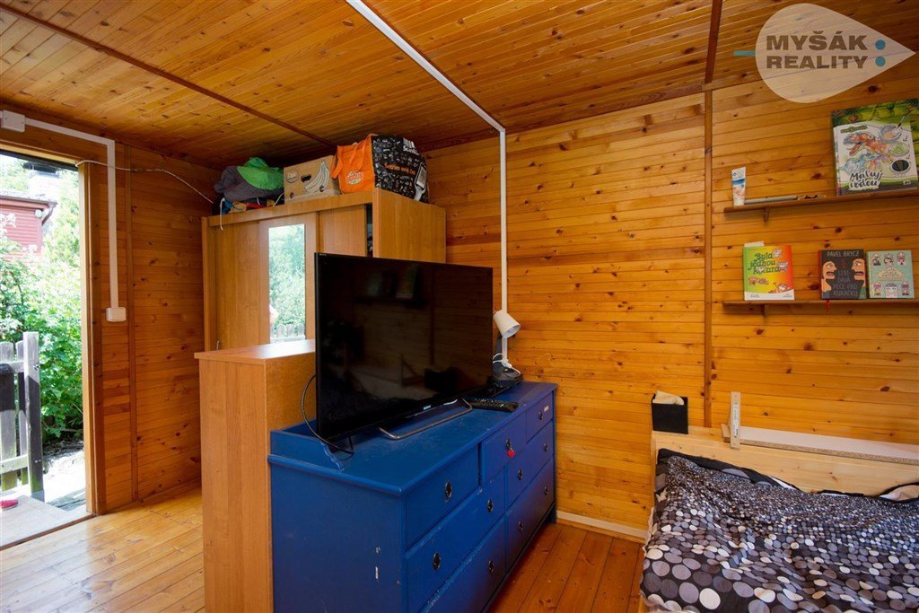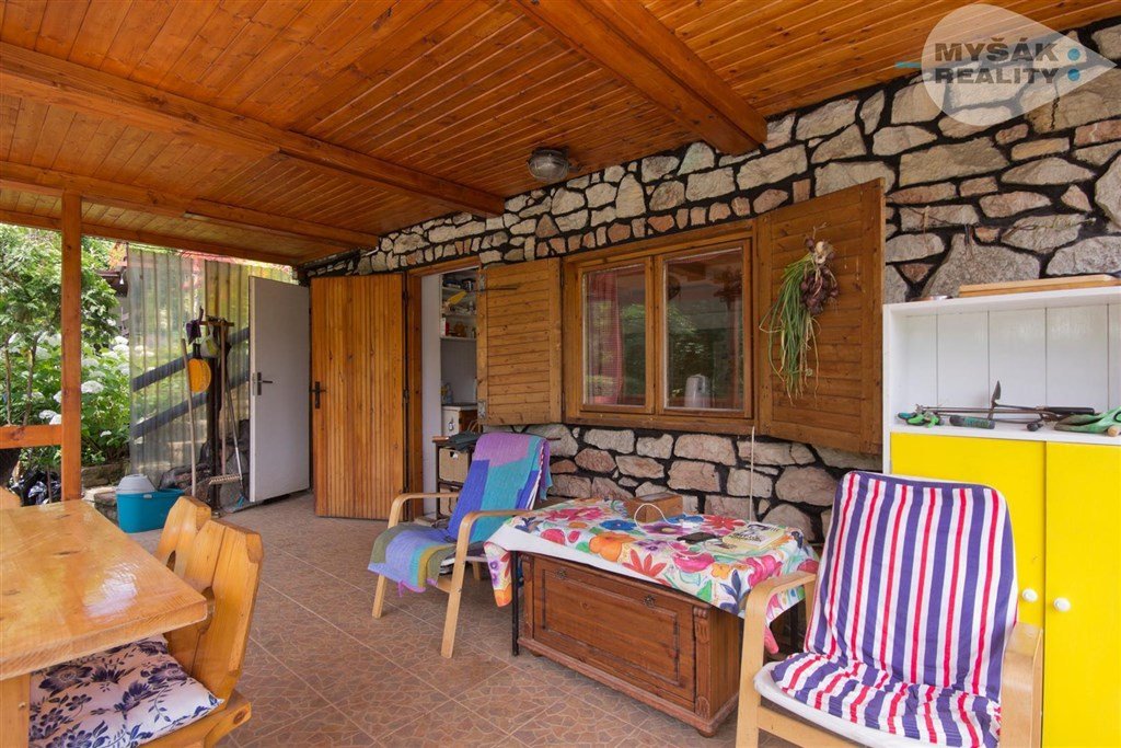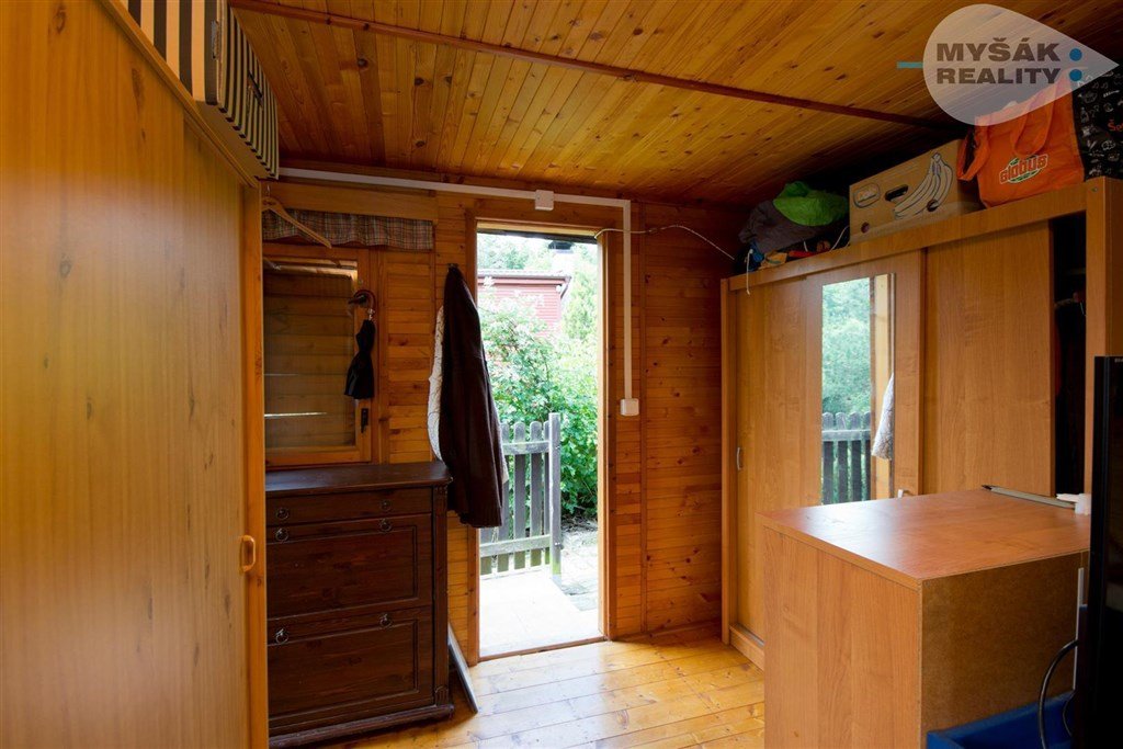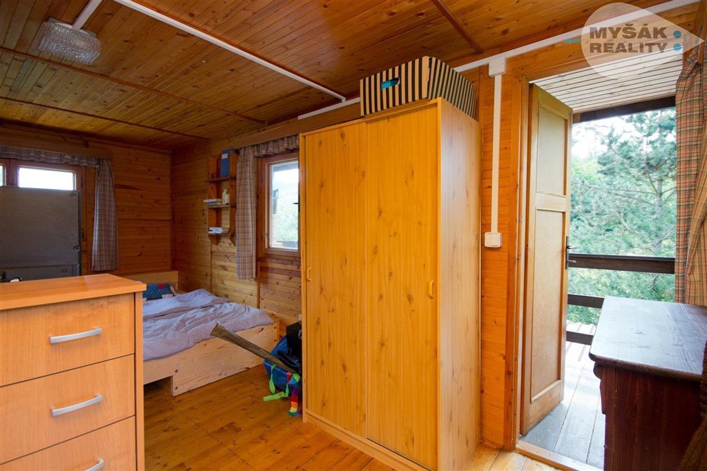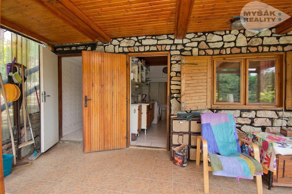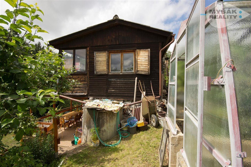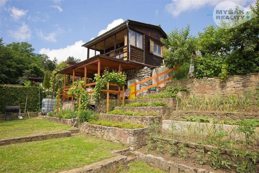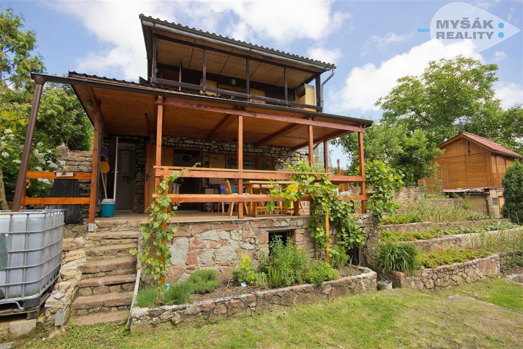 V příjemně svažité zahradě leží chata, klasická dřevostavba s fortelnou kamennou podezdívkou. V její horní části je prostorná ložnice s terasou a dřevěnými skříněmi, ve spodní části chaty najdete velkou kuchyň, koupelnu s toaletou, bojlerem, umyvadlem a sprchovou hlavicí. Z kuchyně i koupelny vyjdete přímo na krásnou, novou verandu, kde budete určitě trávit všechna svá rána u kávy a večery u vína a piva s kytarou, ať budou vedra, nebo letní bouřky. Chata má i svůj sklep.