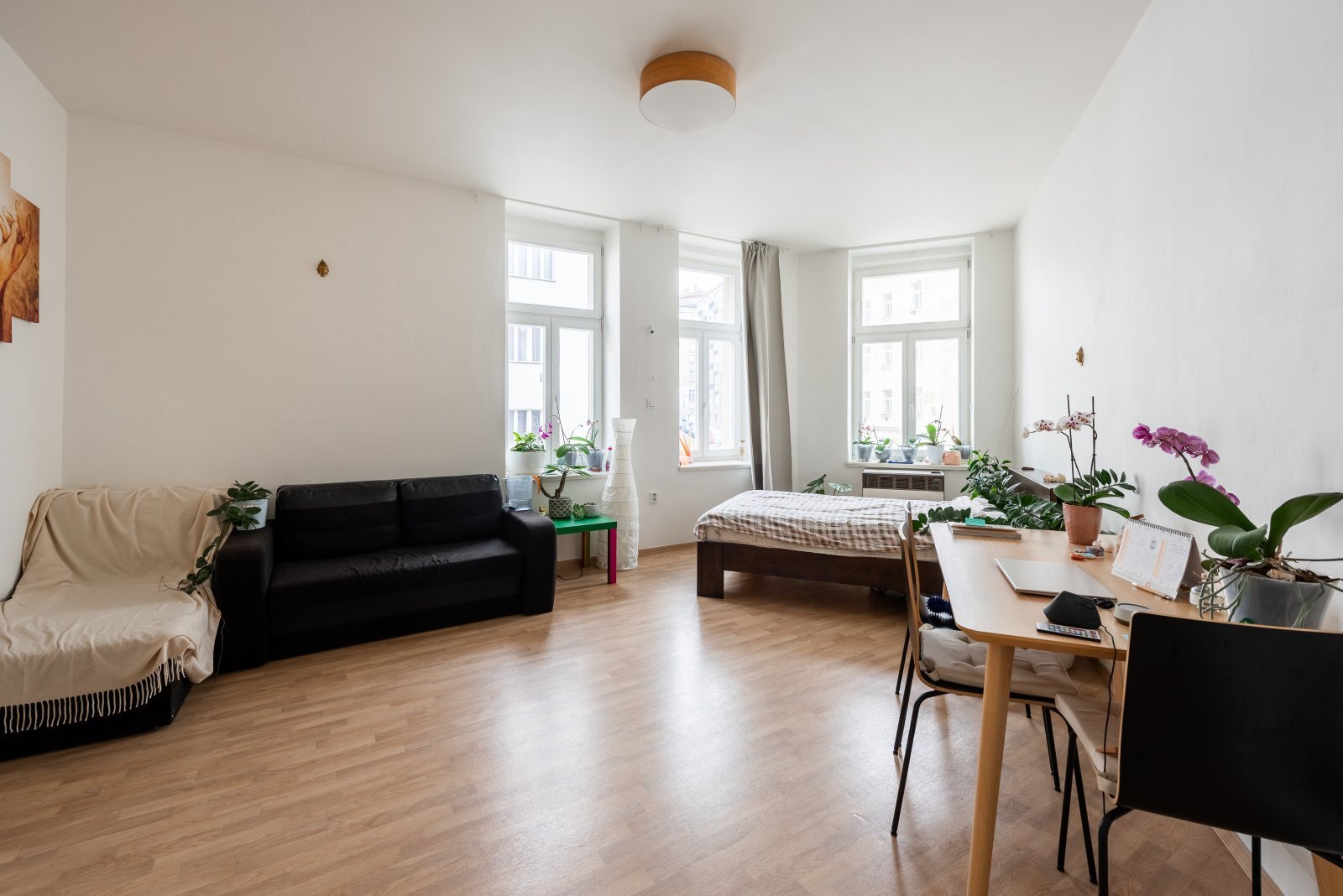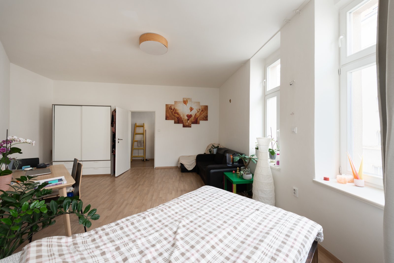Dispozice bytu je ideální pro jednotlivce nebo pár, který si potrpí na pozitivní prostor a světlo. Obě místnosti jsou orientovány směrem do ulice. Obývací pokoj (o velikosti 24,5m2) plynule navazuje na kuchyň, útulná koupelna je vybavena sprchovým koutem, toaleta je vedena samostatně. Kuchyňská linka je plně vybavena – plynový sporák, elektrická trouba, digestoř, lednice – připravena na nedělní obědy i večerní improvizace.