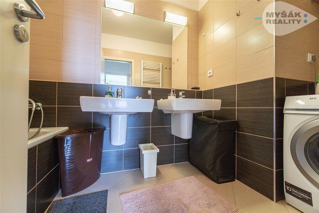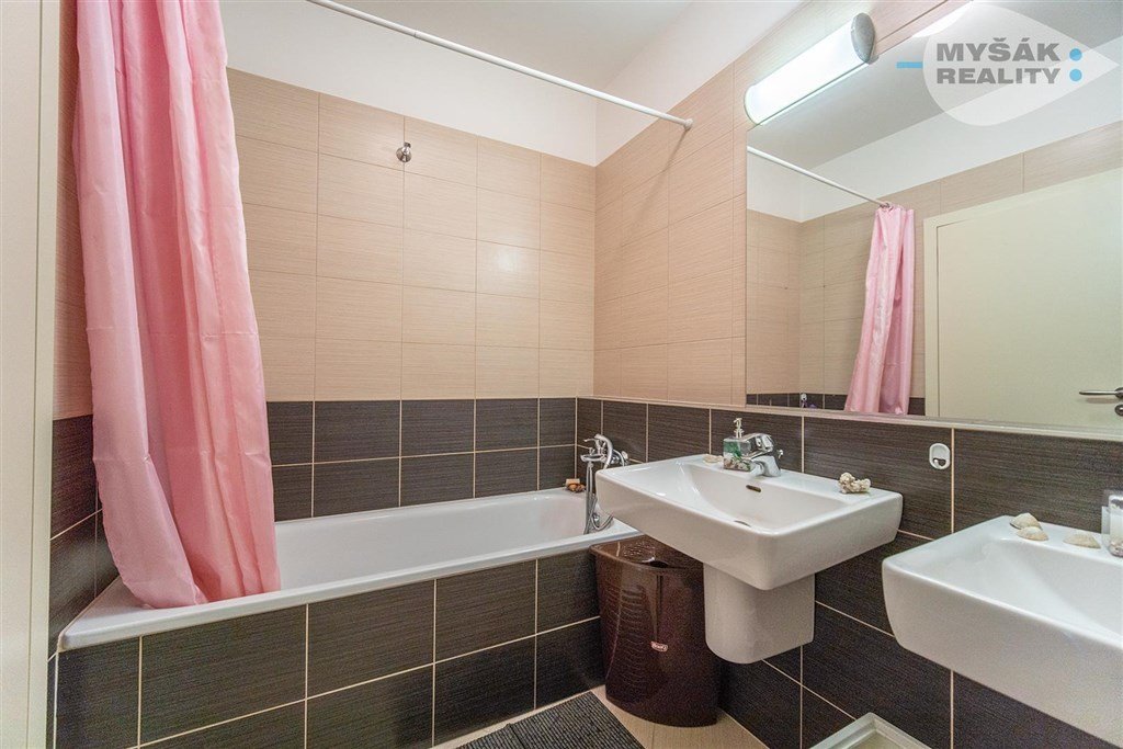 Obě ložnice jsou neprůchozí a mají pěknou výměru (13,3 a 12,8 m2). Díky velkým oknům jsou plné světla a z větší ložnice je také vstup na terasu. Koupelna s tmavším nadčasovým designem je vybavena vanou a dvěma umyvadly. Pračka je zde umístěna do výklenku. Toaleta je vedena odděleně. V bytě je také praktická komora.