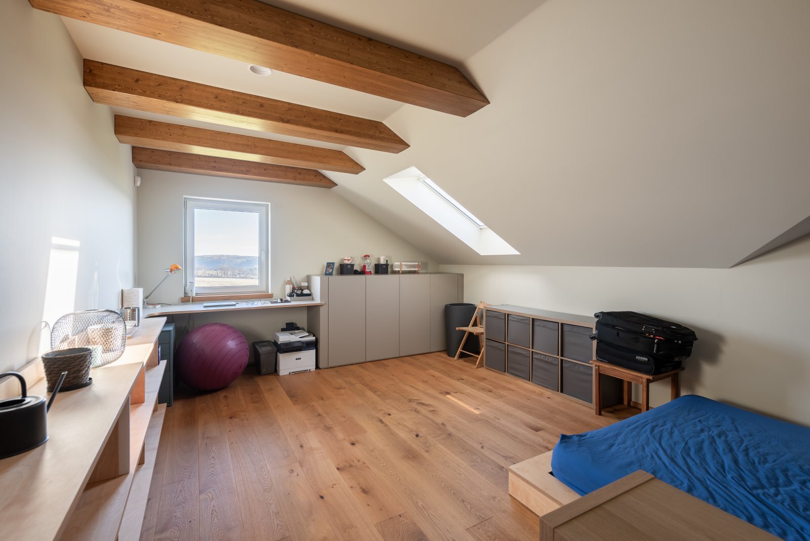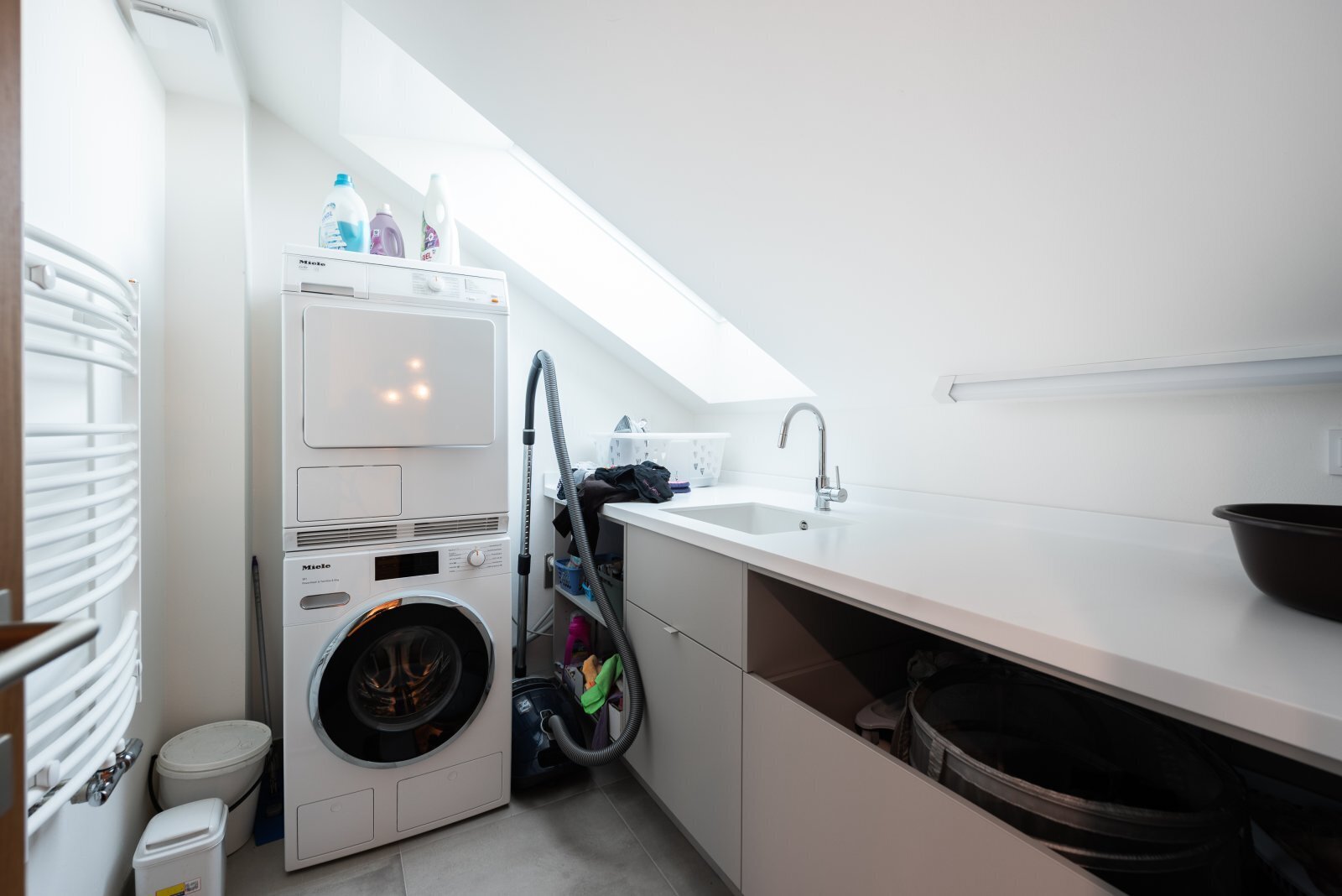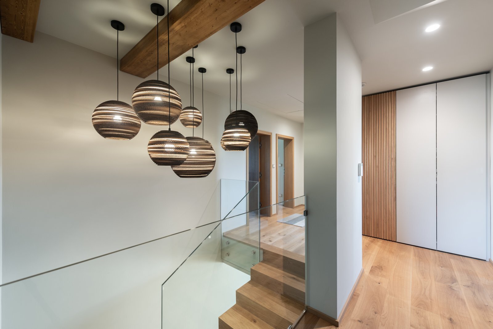 Ve spodním patře domu se nachází prostorný obývací pokoj, kuchyně s plně vybavenou kuchyňskou linkou (vše řešeno na míru, spotřebiče Miele), prostorná zimní zahrada, větší ložnice, koupelna se sprchovým koutem a wc, spousta úložných prostor řešených na míru. Z prvního podlaží se taktéž dostanete do velké garáže, která lze využívat pro parkovaní dvou automobilů, případně taktéž jako další úložný prostor. Po schodech se dále dostaneme do druhého podlaží, kde se aktuálně nachází 4 ložnice, technická místnost a koupelna, kde je k dispozici sauna a otužovací sud. K dispozici je taktéž dobře přístupná půda, velmi praktická na uložení mj. sezonních věcí.