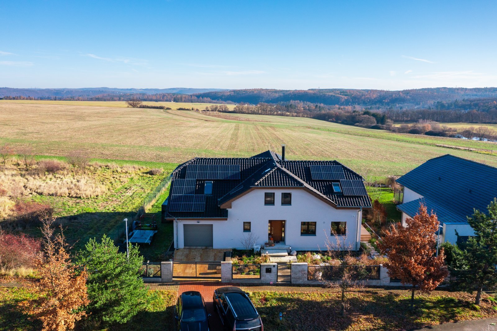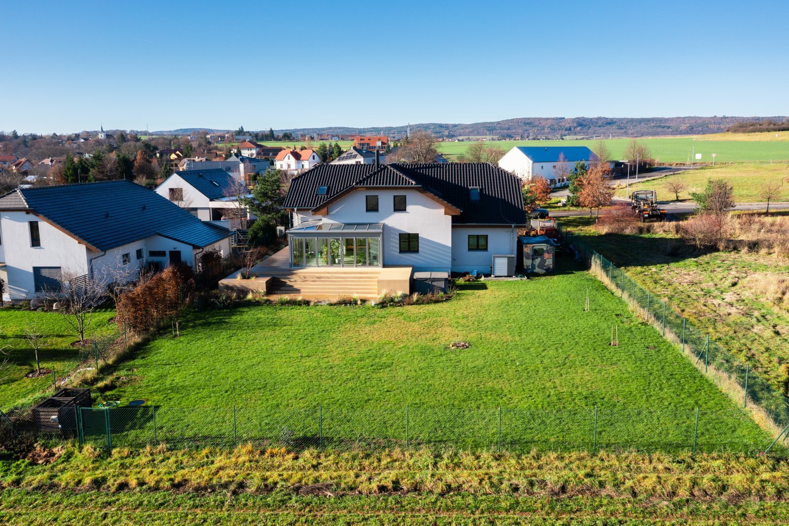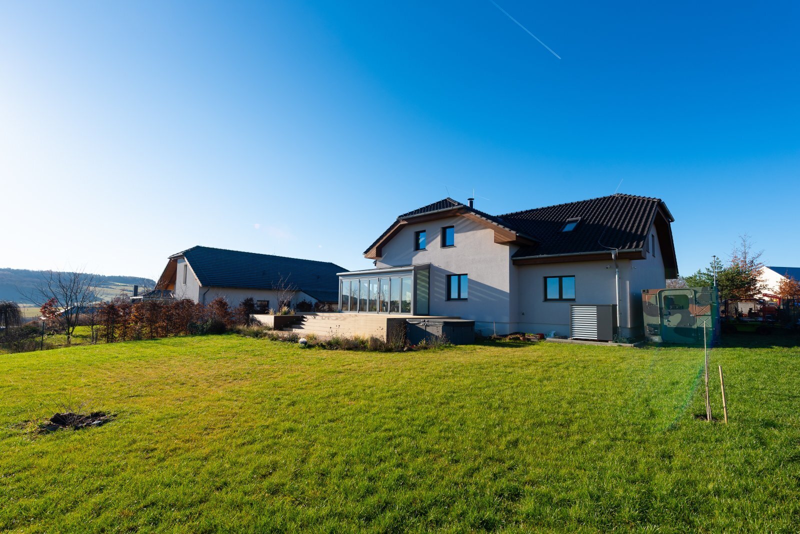 K dispozici jsou veškeré technické sítě, tepelné čerpadlo, podlahové vytápění v celém domě. Na zahradě je k dispozici vířívka, užitkovou vodu zajišťuje retenční nádrž. Dům nevznikl náhodou, ale jako promyšlený domov pro každodenní život, odpočinek i setkávání. Místo, kde rána začínají pohledem do zeleně, dny plynou v absolutním soukromí a večery končí v teple domova, který dává smysl.