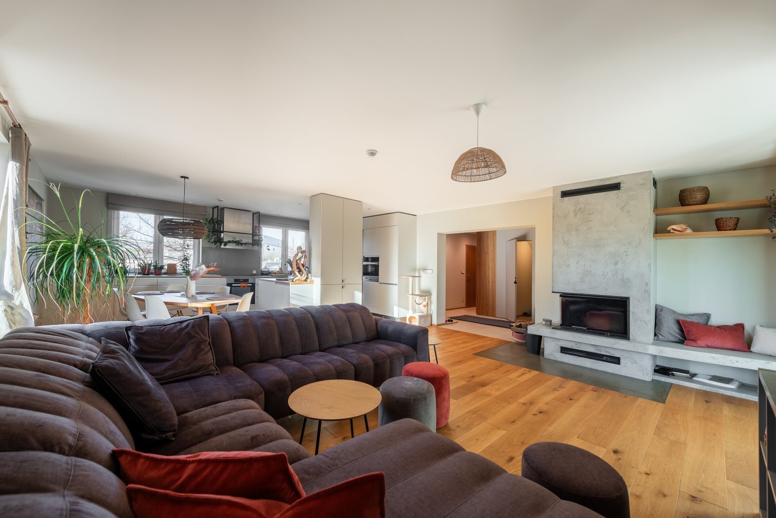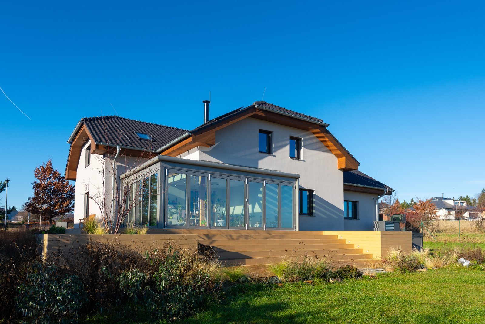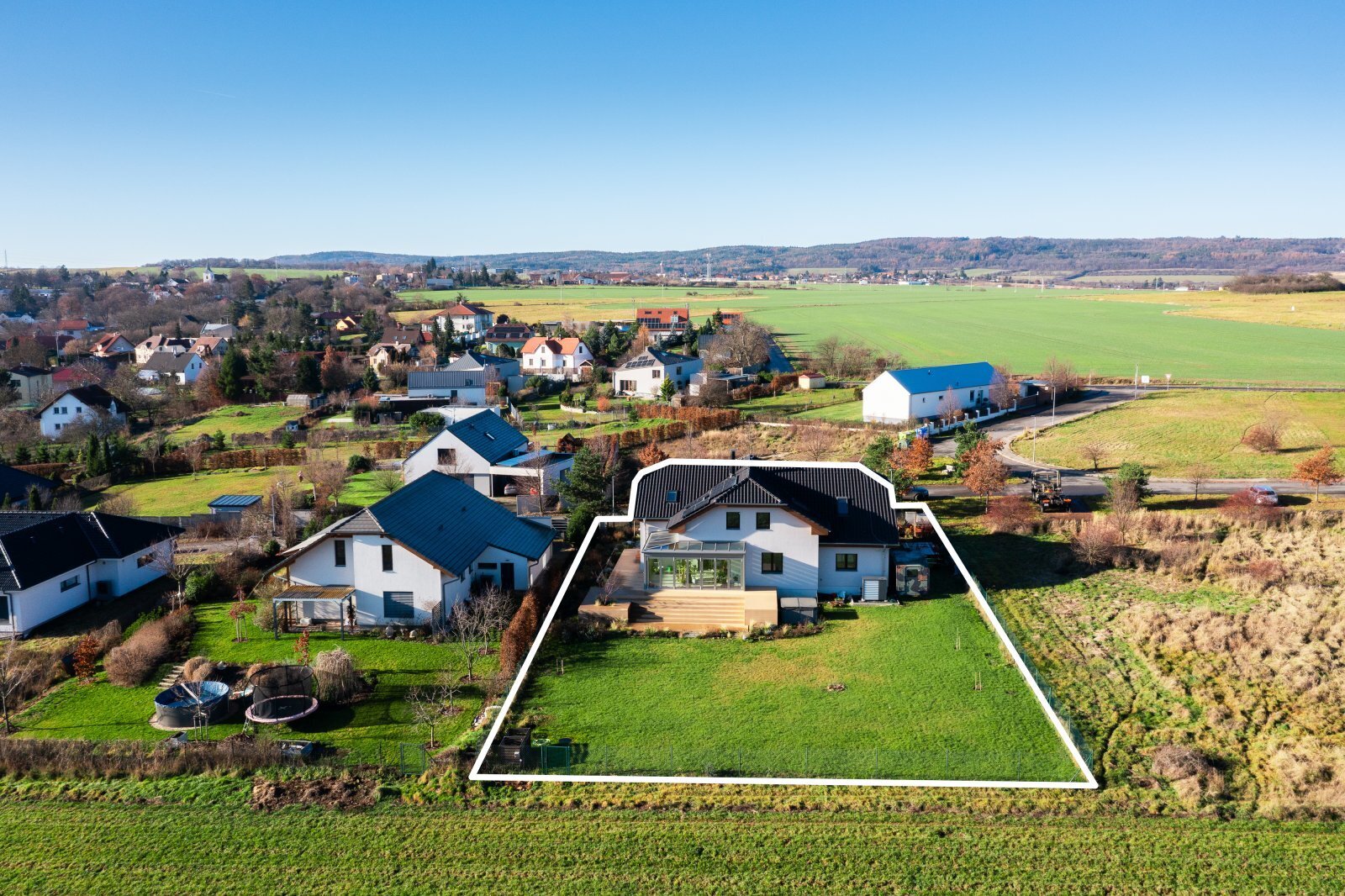 K dispozici jsou veškeré technické sítě, tepelné čerpadlo, podlahové vytápění v celém domě. Na zahradě je k dispozici vířívka, užitkovou vodu zajišťuje retenční nádrž. Dům nevznikl náhodou, ale jako promyšlený domov pro každodenní život, odpočinek i setkávání. Místo, kde rána začínají pohledem do zeleně, dny plynou v absolutním soukromí a večery končí v teple domova, který dává smysl.