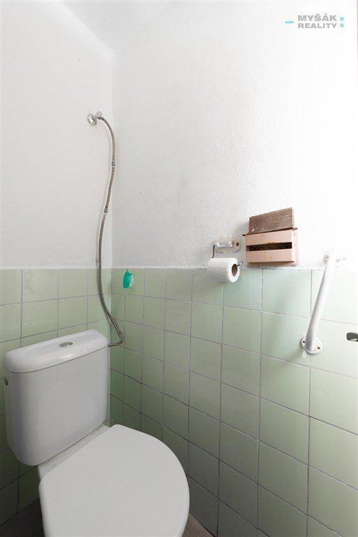 Koupelna je vybavena velkým sprchovým koutem, pračkou, topným žebříkem a malým přímotopem nad dveřmi. Toaleta je samostatně.